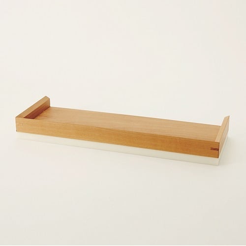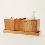 トイレや洗面カウンタ―向けに開発したりんごの木と人工大理石を使ったアウトバス製品用トレイです。ボックスタイプのソープディスペンサー、歯ブラシスタンドなどが3個ちょうど収まるデザインです。