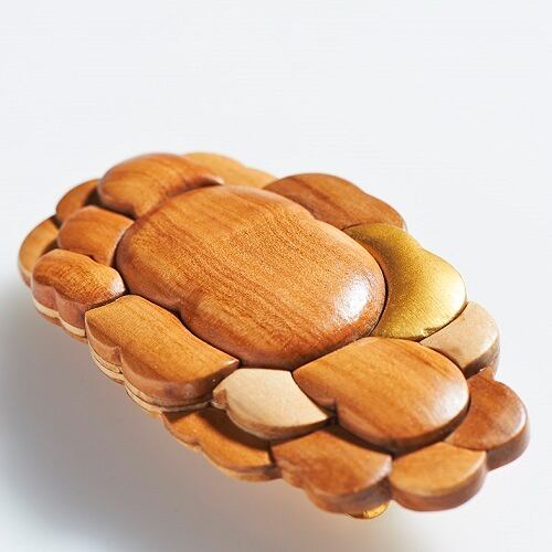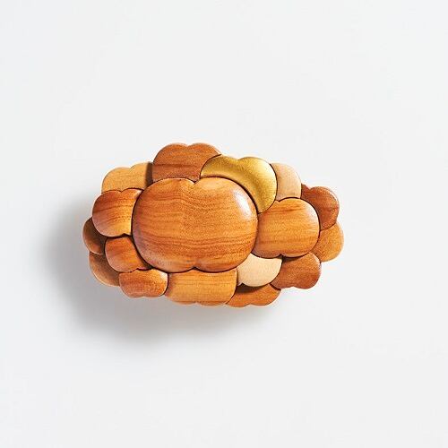 たくさんのりんごの中からたった一つ、陽の光を浴び輝く。ひとつひとつのパーツを削り出し、組み合わせています。一つのりんごだけに金粉を施しています。